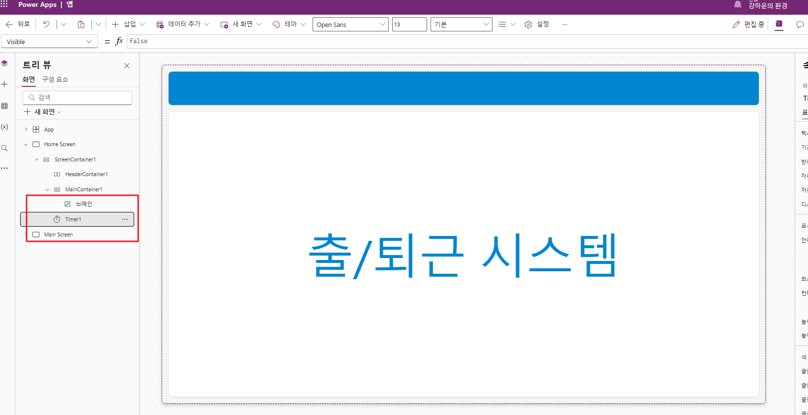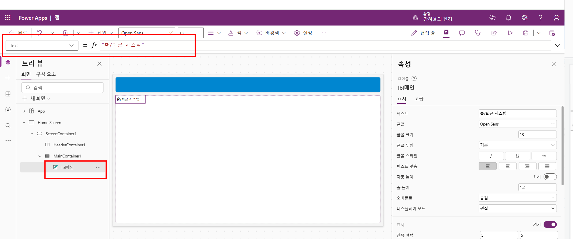 텍스트에는 “출/퇴근 시스템”을 입력한다.