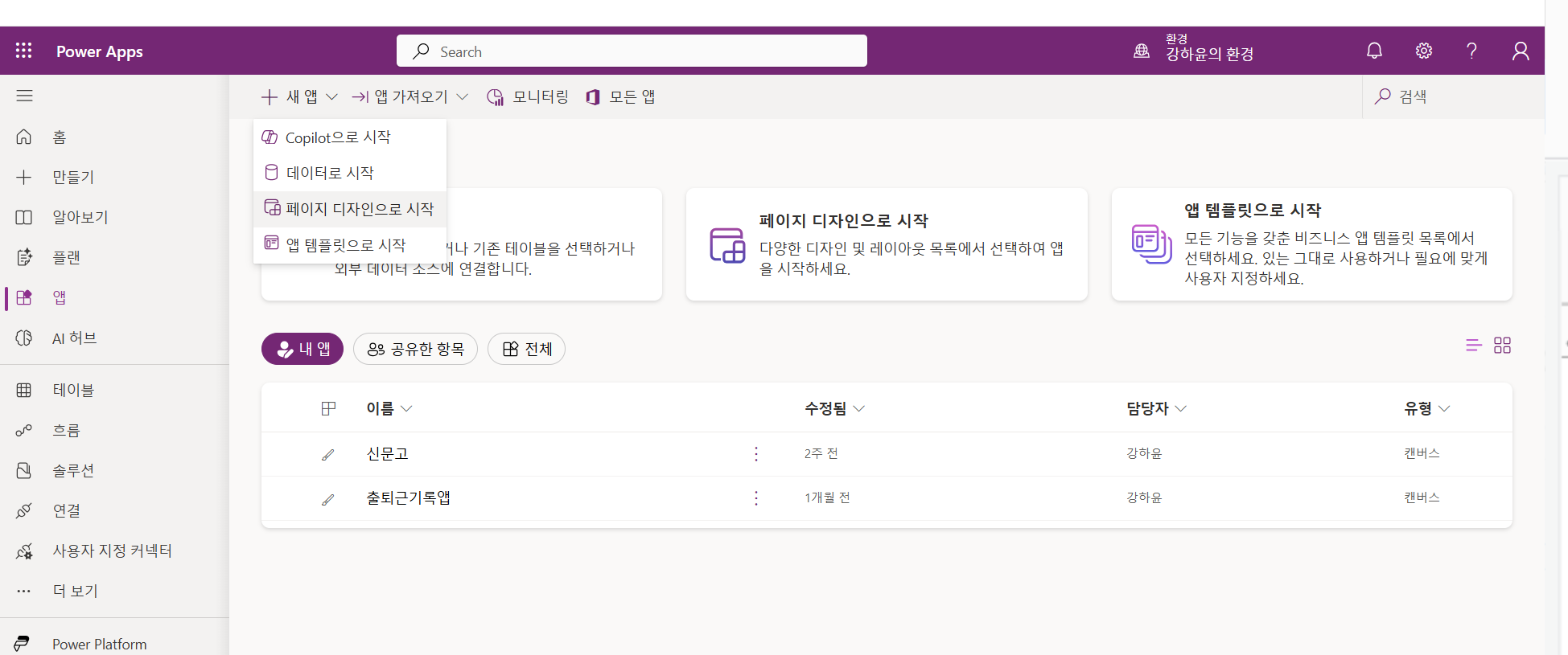 저번 포스팅에서는 테이블들을 구축했으니, 이제 본격적으로 powerapps에서 앱을 만들어 보겠다.